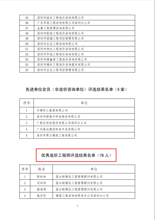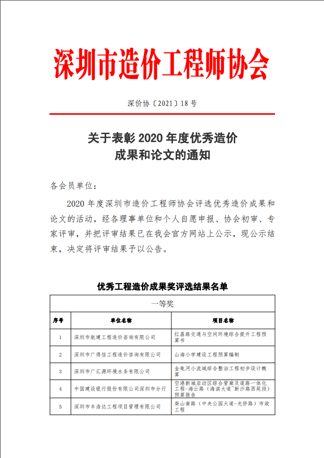 2020年度深圳市造價(jià)工程師協(xié)會(huì)評(píng)選先進(jìn)單位、優(yōu)秀個(gè)人、優(yōu)秀造價(jià)咨詢成果和論文的活動(dòng),經(jīng)各理事單位和個(gè)人自愿申報(bào)、協(xié)會(huì)初審、專家評(píng)審,評(píng)審結(jié)果經(jīng)過公示,現(xiàn)于深圳市造價(jià)工程師協(xié)會(huì)網(wǎng)站公告。