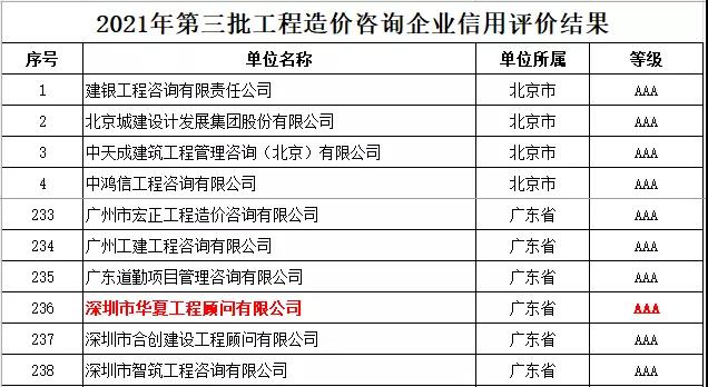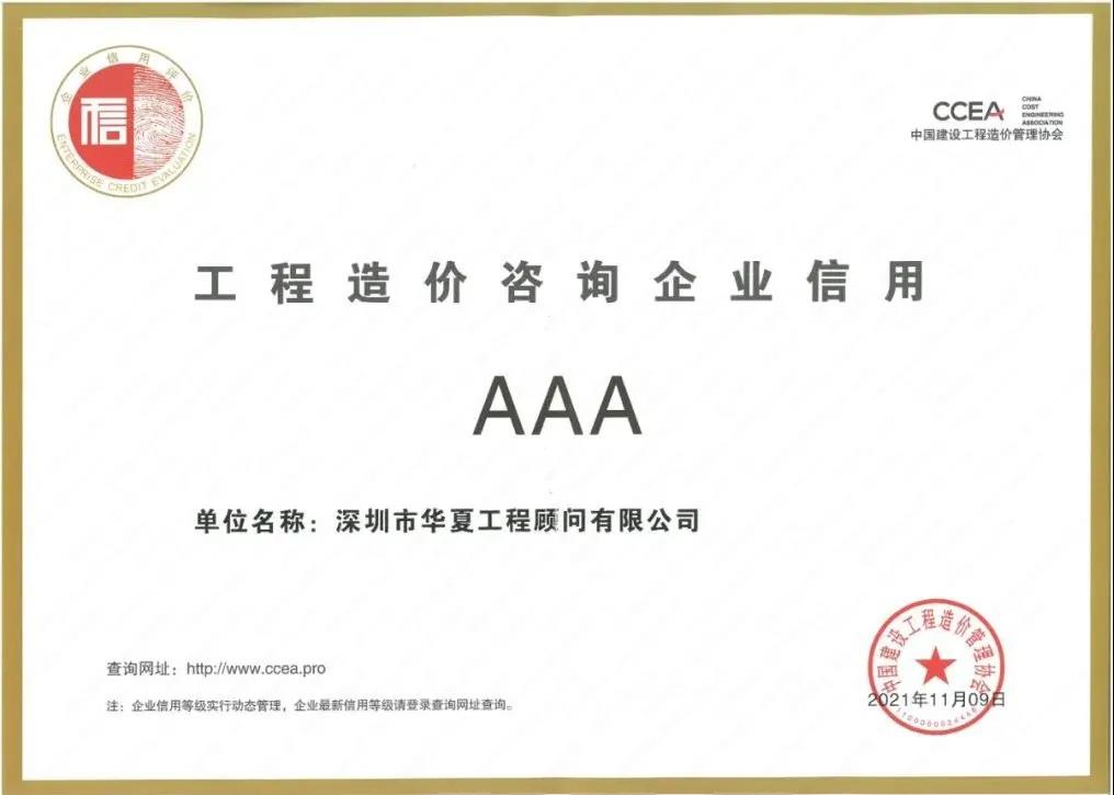 近期,中國建設(shè)工程造價(jià)管理協(xié)會(huì)(以下簡稱:中價(jià)協(xié))公布了2021年第三批工程造價(jià)咨詢企業(yè)信用評(píng)價(jià)結(jié)果。經(jīng)企業(yè)申報(bào)、各省級(jí)工程造價(jià)行業(yè)協(xié)會(huì)(中價(jià)協(xié)專業(yè)工程委員會(huì))初評(píng),中價(jià)協(xié)組織專家終評(píng),深圳市華夏工程顧問有限公司獲評(píng)中價(jià)協(xié)工程造價(jià)咨詢企業(yè)信用評(píng)價(jià)最高等級(jí)——AAA級(jí)!