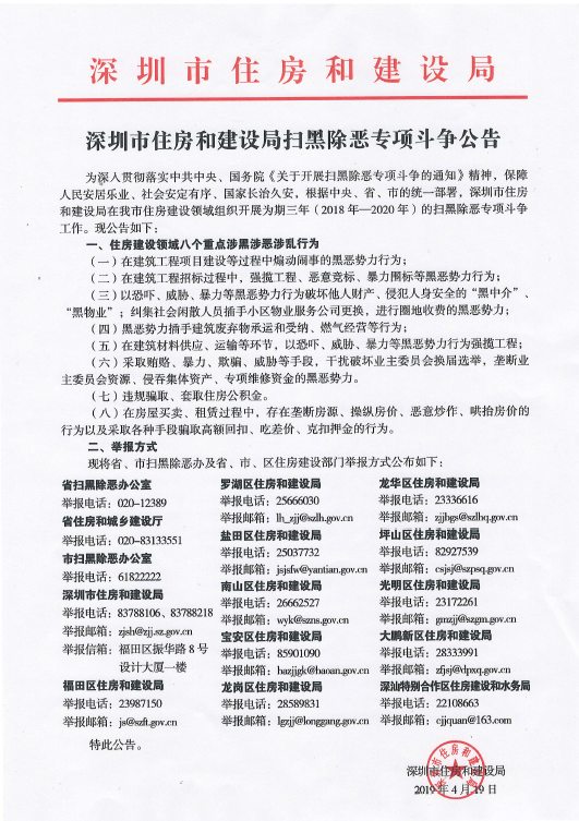 深圳市住房和建設局掃黑除惡專項斗爭公告